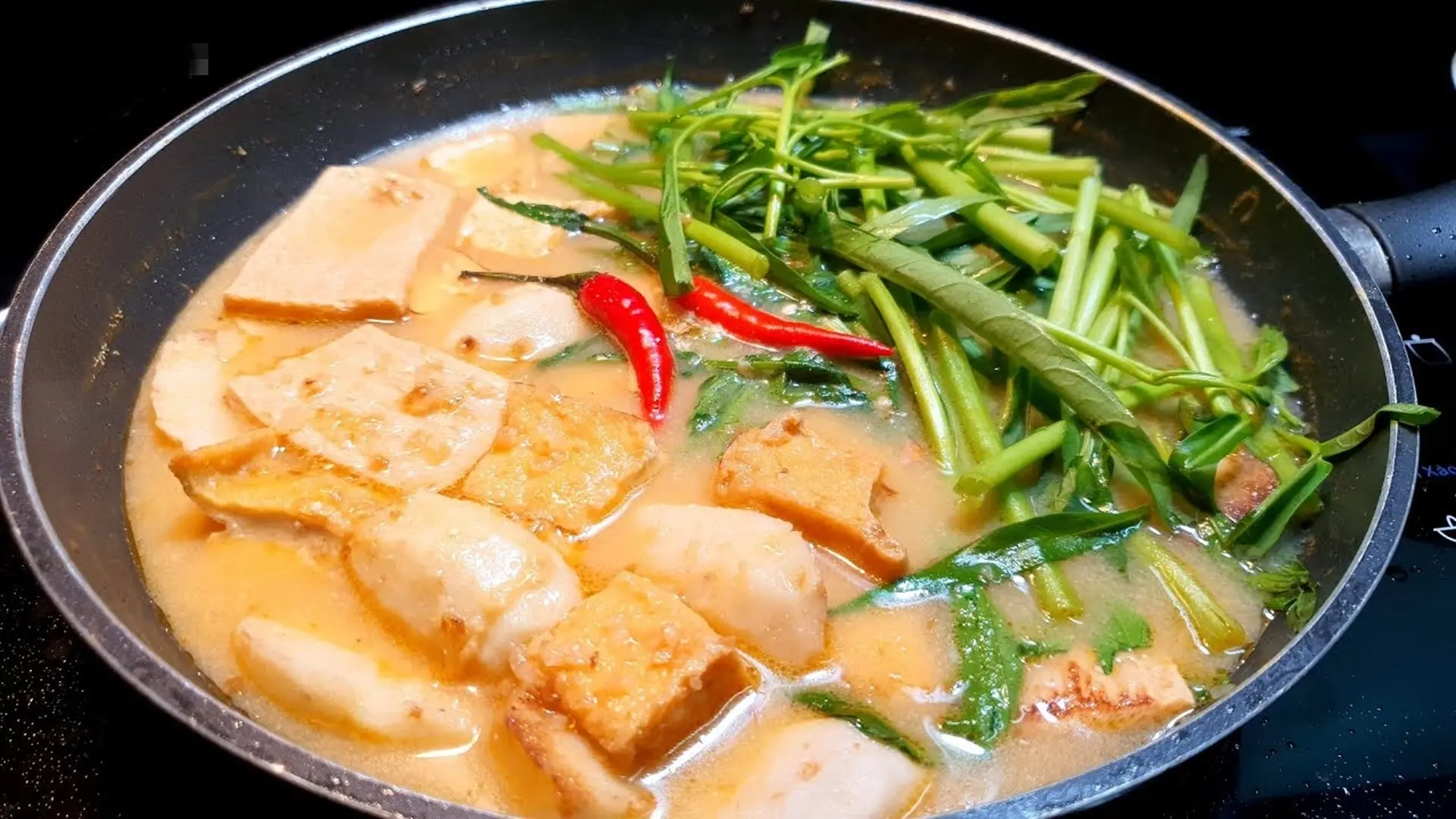Đun trên lửa vừa trong 15 phút đến khi nước bắt đầu sôi và khoai môn mềm thì thả cà rốt, đậu hũ, mọc chay và chả chay vào. Trong lúc chờ nước sôi trở lại, lấy 2 – 3 viên chao cho vào chén, tán nhuyễn với một ít nước rồi từ từ cho vào nồi nước dùng, khuấy đều để chao tan hoàn toàn.